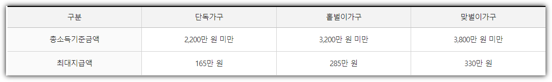 홑벌이가구는 배우자 또는 부양자녀 또는 70세 이상 직계존속이 있는 가구(배우자가 있는 경우에는 신청인 또는 배우자의 총급여액 등이 3백만원 미만이어야 함)