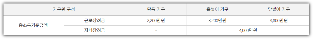 맞벌이가구인 경우, 근로장려금 총소득기준금액은 3,800만원입니다.