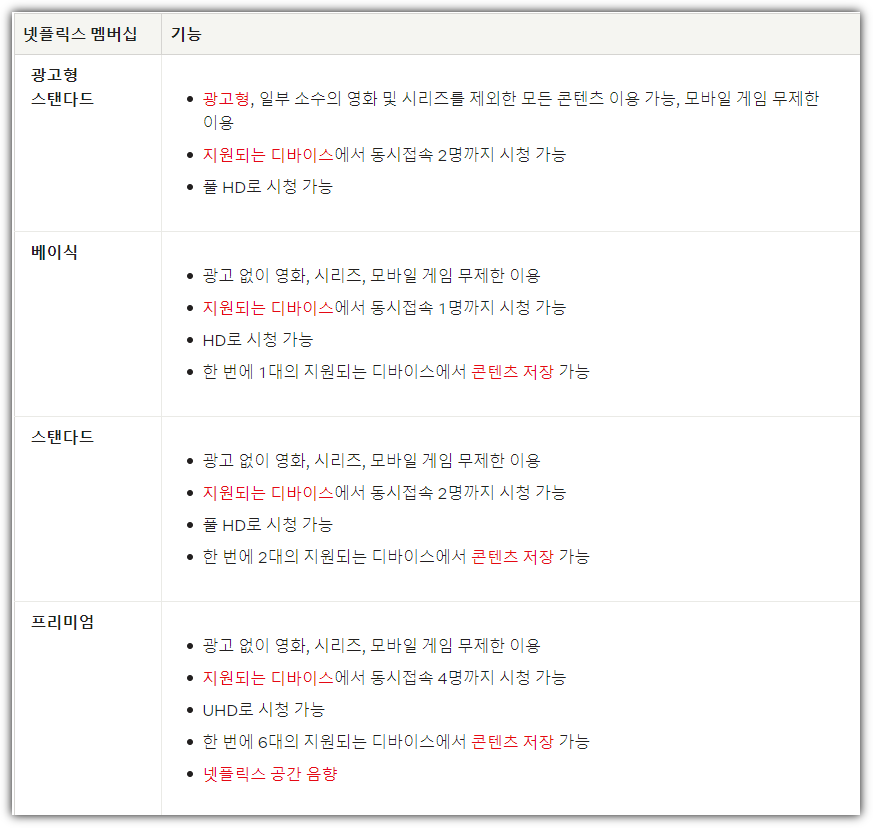 넷플릭스 요금제가 2023년 기준으로 4가지가 있다고 말씀드렸는데요, 이를 간단히 정리하면 다음과 같습니다.