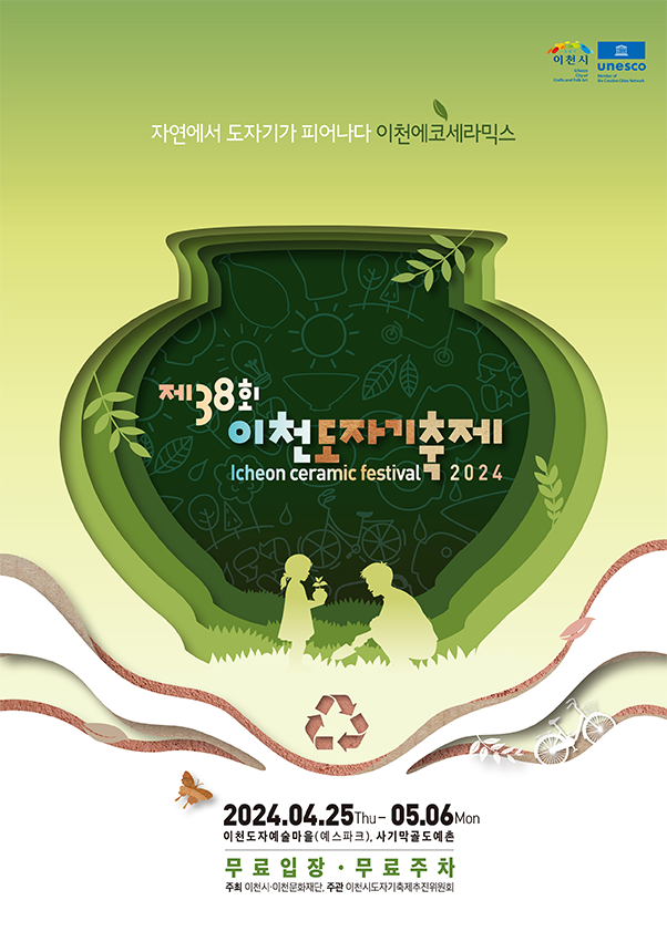 2024년 제38회 이천도자기축제는 '자연에 도자기가 피어나다, 이천에코세라믹스'를 주제로 일회용품 사용 지양, 도자제품 사용을 권고하며 친환경 용기 사용을 적극 장려합니다. 대형돔 도자 전시, 명장전, 도자기x지역콜라보 세트 한정판 제품, 행복한 삼만원전, 트레저헌팅(보물찾기), 버스킹 등 이천도자기축제의 한층 업그레이드 된 체험, 전시, 판매를 볼 수 있으니 12일간 하루도 빠짐없이 축제를 즐길 수 있습니다.